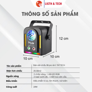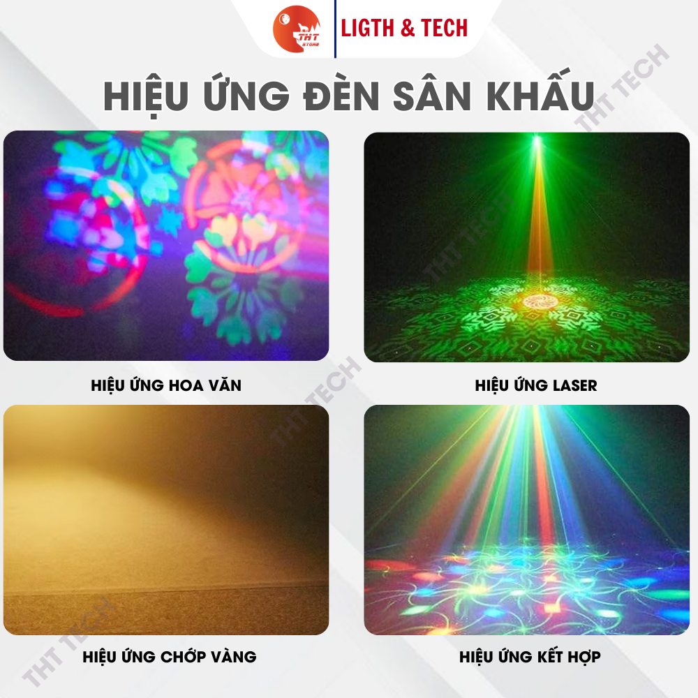 Hiệu ứng: dải LED RGB + Laser xanh/đỏ + hoa văn cầu + 2 chớp vàng