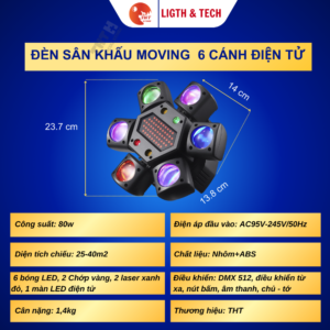 Đèn Sân Khấu Moving 6 Cánh Điện Tử THT Light & Tech với công suất mạnh mẽ 80W, thiết kế hiện đại cùng 6 bóng LED đa màu, 2 chớp vàng, 2 laser xanh đỏ và màn LED điện tử sẽ mang đến trải nghiệm ánh sáng đỉnh cao, phù hợp cho mọi không gian giải trí.