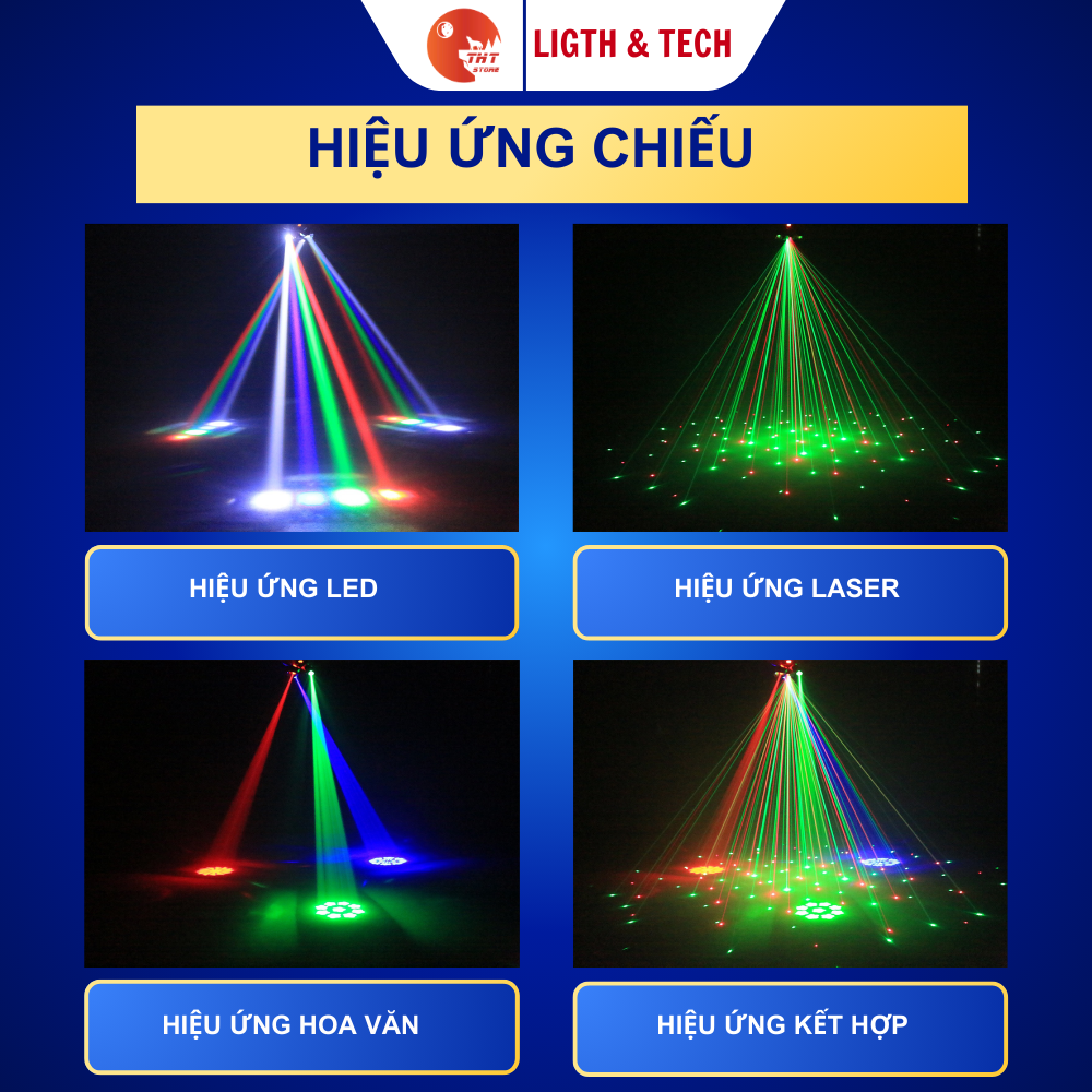 ⚡ 2 chớp vàng + 2 laser xanh đỏ: Hiệu ứng mạnh mẽ, sôi động, cực kỳ nổi bật trên sân khấu.